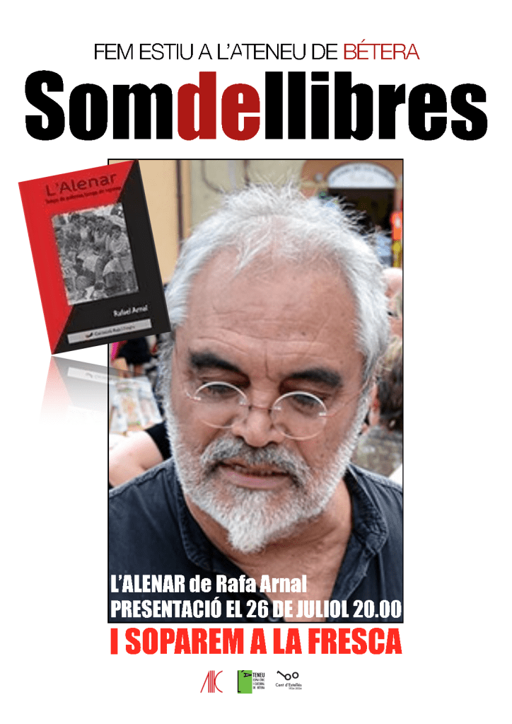 “L’alenar, temps de pobresa i de represa” de Rafa Arnal, és la història personal i particular dels darrers seixanta anys del segle XX de molts pobles del País Valencià. Una memòria viscuda i lluitada amb un compromís ferm en favor dels valencians: de la riuada del 1949, que com a Bétera, va desemparar-nos…, el Camp de Túria, l’horta, o la riuada de la Transició política dels setanta -vuitanta, que encara ens va desemparar més intensament. Un llibre que ens repassa qui som, què vam poder ser, i tota la pols que ens va deixar el camí, als ulls i a les espardenyes. De la lectura d’una vida sòbria, en farem cabal divendres 26 de juliol a l’ateneu. Benvinguts.