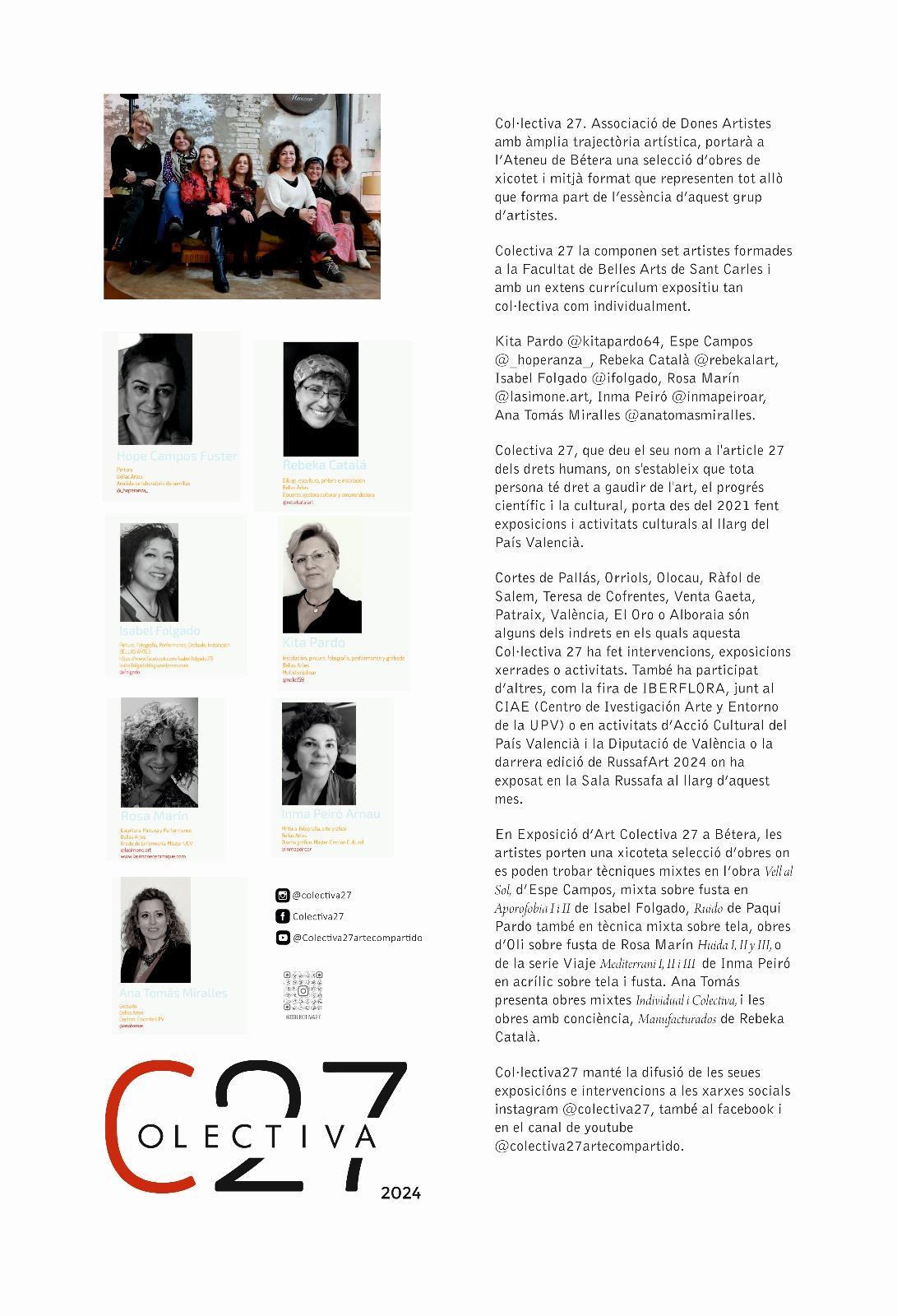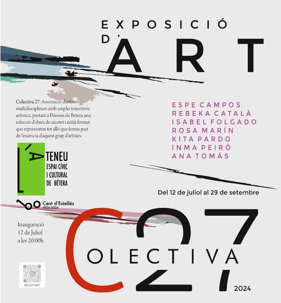 Una obra col.lectiva de temàtiques i tècniques diverses, que ens endinsen en el món creatiu de l’associació d’artistes multidisciplinars “Colectiva 27”. Aquestes dones ens donaran a conèixer una mostra dels seus treballs, en xicotet i gran format: creativitat, diversitat, imaginació, investigació artística, reflexió. Un tast molt interessant de cultura creativa de proximitat .