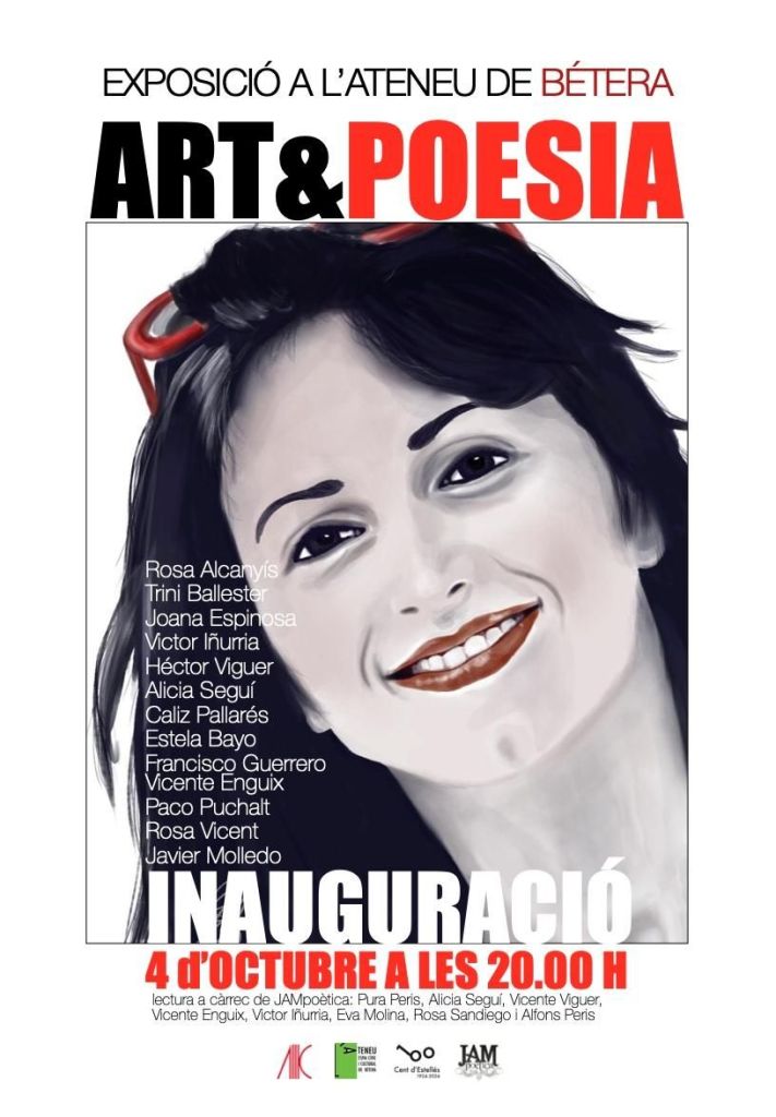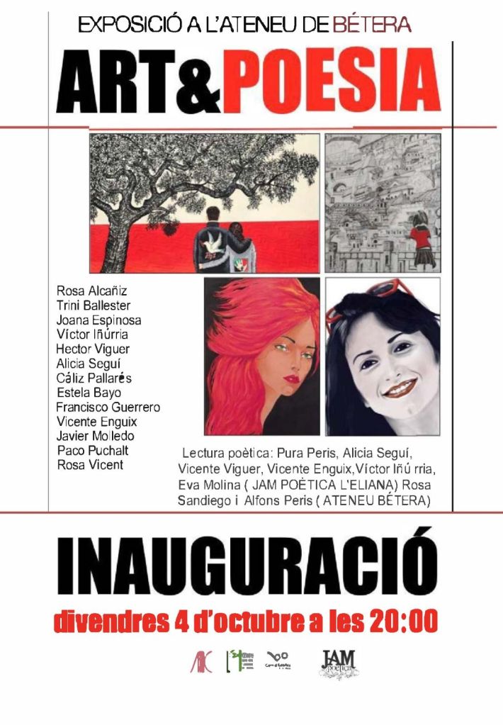 Exposició d’Art i poesia Títol: Art i Poesia. Roig i negre Dates: Del 4 d’octubre al 30 de novembre Inauguració: divendres 4 d’octubre, a les 20 h Lloc: Ateneu de Bétera Ressenya: Aquesta exposició, comissariada per Alicia Seguí, mostra l’obra pictòrica d’artistes de lʻEliana , un col·lectiu, d’artistes i poetes que s’uneixen en un projecte comú per a posar en valor l’art i la literatura com a mitjà d’expressió cultural. L’exposició tracta el tema “Roig i Negre”. Combinació de pintures en roig i negres, acompanyades de poesies escrites i recitades per poetes de lʻassociació JAM Poètica de lʻEliana: Pura Peris, Alicia Seguí, Vicente Viguer, Vicente Enguix,Victor Iñurria, Eva Molina, Rosa Sandiego i “Alfons Peris” (Ildefons C). Amb pintures de: Rosa Alcañiz, Trini Ballester, Joana Espinosa, Victor Iñurria, Héctor Viguer, Alicia Seguí, Cáliz Pallarés, Estela Bayo, Fco. José Guerrero, Vicente Enguix, Paco Puchalt, Rosa Vicent, Javier Molledo. Un col·lectiu emprenedor unit per l’Art i la Cultura