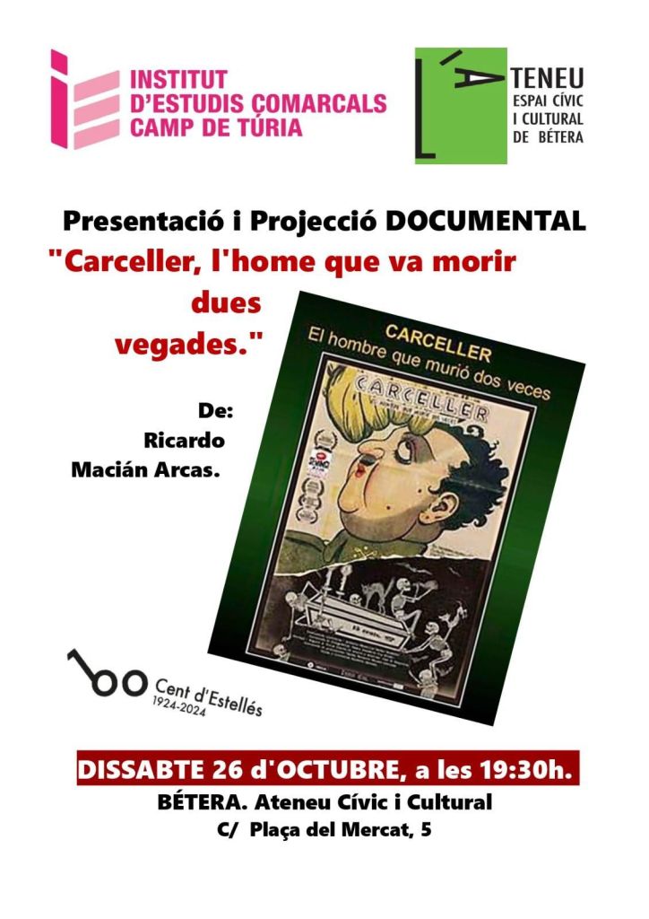 El proper dia 26 d’octubre, en coordinació amb l’Institut d’Estudis Comarcals del Camp de Túria, us oferim una nova proposta cultural i de País: Presentació i projecció del documental “ Carceller, l’home que va morir dues vegades”