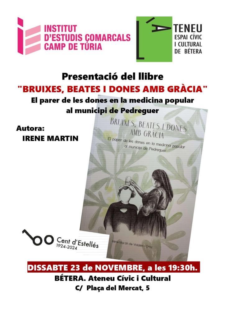 Presentació del llibre📚📚: “Bruixes, beates i dones amb gràcia“, d’Irene Martí, el dissabte dia 23 de novembre , a les 19:30 h, a l’Ateneu de Bétera, en coordinació amb l’IDECO Camp de Túria. Aquest llibre és un estudi de caràcter etnogràfic que té com a objecte central visibilitzar les pràctiques de salut comunitària que han realitzat les dones de Pedreguer al llarg del temps i que, a més, aporta una visió que connecta Pedreguer no sols amb dones del voltant de la Marina Alta, sinó d’altres llocs com les illes Balears o terres sud-americanes. La seua funció és recuperar i fer valdre el paper d’aquestes dones a partir de la memòria i el diàleg amb el present. Així doncs, l’estudi recull diverses ‘malalties culturals’, referides a les malalties definides des d’un àmbit sociocultural i tractades amb etnomedicina o rituals magicosimbòlics, junt amb els seus diagnòstics i rituals de tractament, com per exemple, trencar l’enfit o treure berrugues