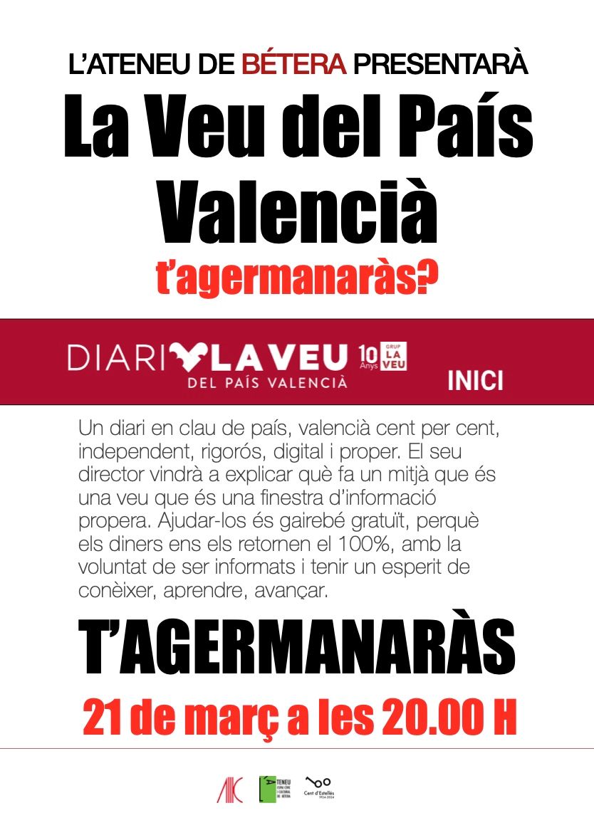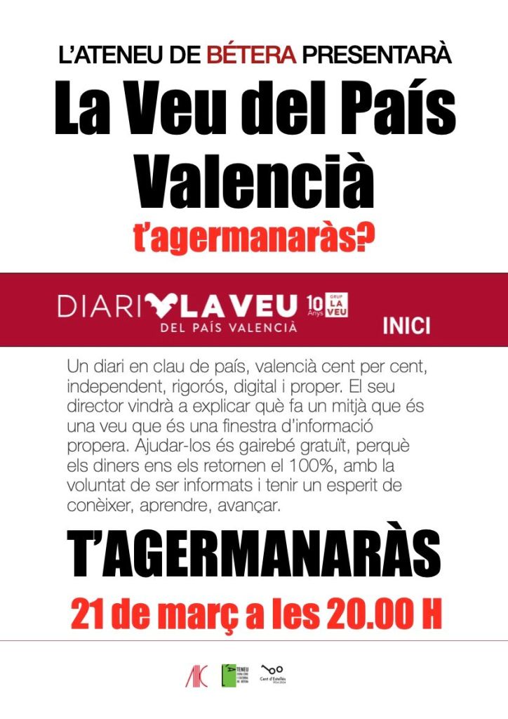 El seu director, Moisès Vizcaino, vindrà a l’Ateneu de Bétera, el divendres 21 de març, a explicar com es manté 10 anys, un diari amb una visió compromesa amb la realitat valenciana i la defensa de la llengua i la identitat pròpies.