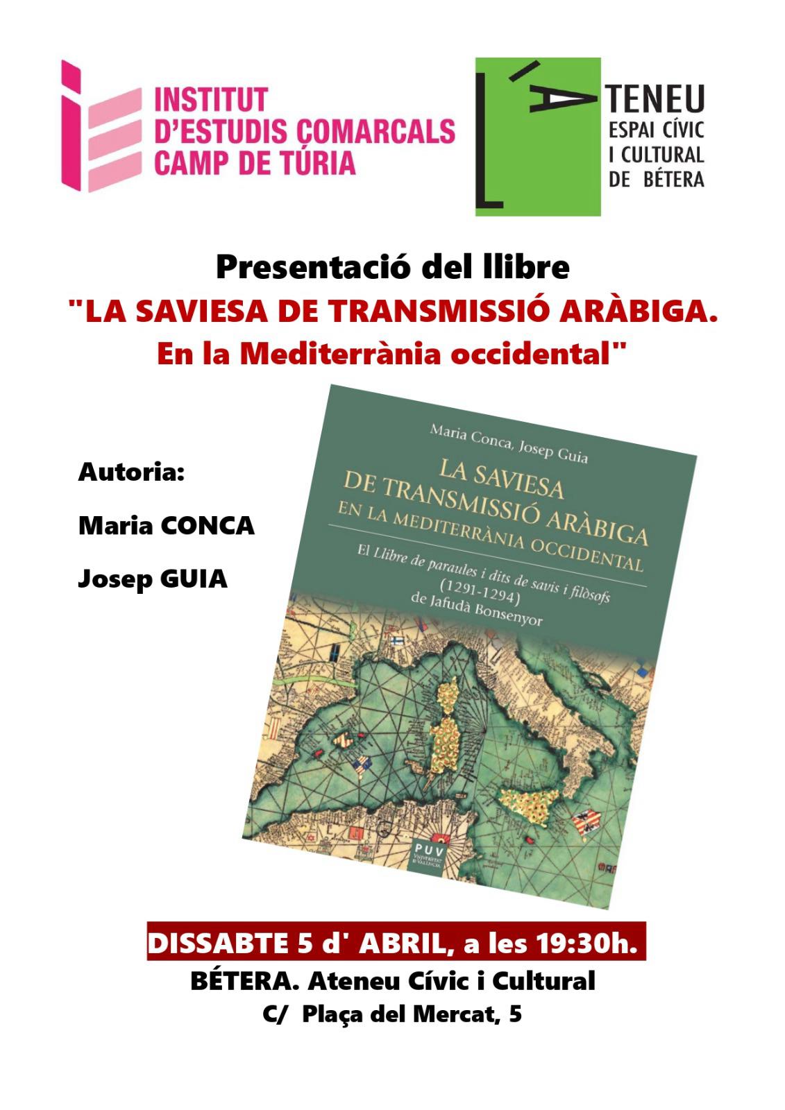 El proper dissabte, dia 5 d’abril, a les 19:30 h, tenim una nova cita cultural a l’ Ateneu de Bétera: presentació del llibre “ La saviesa de transmissió aràbiga. En la mediterrània occidental” a càrrec de Maria Conca i Josep Guia.
