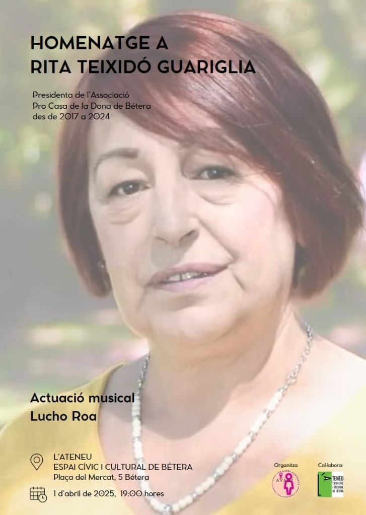 El proper dimarts 1 d’abril retrem homenatge a Marita Teixidó, una gran dona, presidenta i fundadora de l’associació Pro Casa de la Dona de Bétera.
