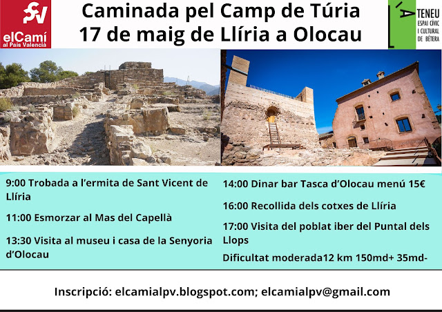 L’associació el Camí al País Valencià, en col·laboració amb l’Ateneu de Bétera, ha organitzat una caminada de Llíria a Olocau per al dissabte 17 de maig. L’eixida es farà de la font de Sant Vicent, es passarà pel mas del Capellà ia Olocau es visitarà la Casa de la Senyoria. També hi haurà dinar i de vesprada es visitarà el Puntal dels Llops.Per apuntar-vos-hi, cal escriure a aquest correu elcamialpv@gmail.com Uns dotze quilòmetres que, l’organització, diu que són d’una dificultat moderada. Va, animeu-vos-hi o animeu-vos-en!