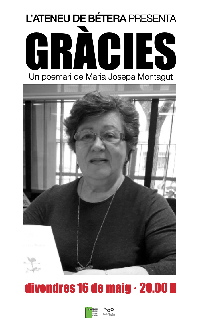 Divendres 16 de maig, a la plaça del Mercat, l’Ateneu presentarà el nou poemari de Josepa Montagut, Gràcies. Rosa Sandiego farà la presentació i la lloa. Una veu poètica senzilla, que reuneix també el compromís per la llengua i la fermesa per la identitat. Josepa Montagut, filòloga, retirada del seu treball administratiu a la facultat de filosofia de València, és veïna de Montcada, a l’Horta, i la seua producció poètica just si va esclatant amb la maduresa. Després del centenari Estellés, creix l’animació poètica a l’Ateneu, sens dubte, amb tot de poemaris i presentacions fruit d’un renaixement per la poesia i la lectura poètica.