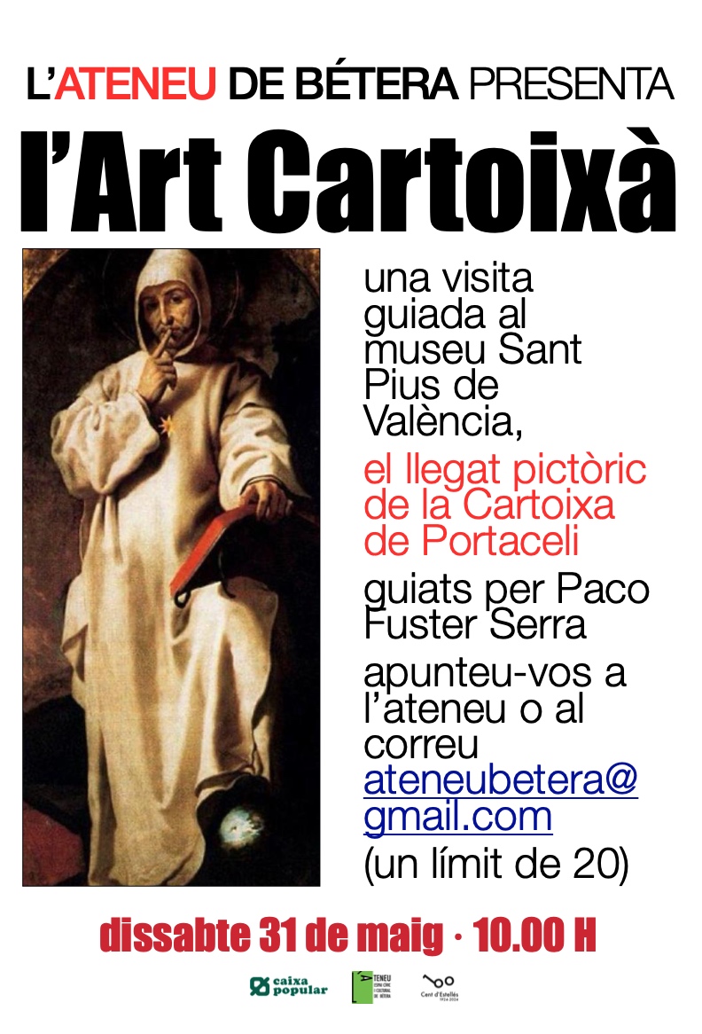 El dissabte, 31 de maig, a les 10 del matí. Porta del Museu Sant Pius de València. Si us heu inscrit a la vista guiada que ens farà l’historiador Paco Fuster, tindreu el privilegi de deixar-vos portar per l’art, la paraula experta i el patrimoni valencià. Paco Fuster s’estigué anys estudiant aquella casa (si hom ho pot dir així, d’aquell monument arquitectònic), les pintures, sobretot les pintures, però també la construcció, l’arquitectura, les cel·les, el claustre… i va fer un llibre gros. Per gaudir de tot plegat, cal inscriure’s a l’ateneu, i tenir sort que el viatge no siga ple ara mateix. Però proveu a veure què passa…