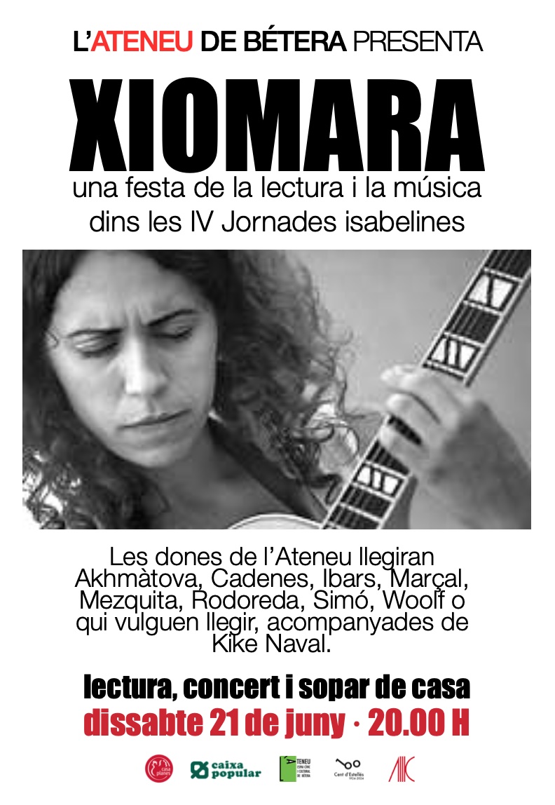 Dissabte 21 , de la mà d’Acció Cultural, arriben a Bétera les  Festes Isabelines per oferir-nos una vetlada literària i musical que celebra el poder de la paraula i la veu de dones escriptores. Autores com Josefa Escrivà, Maria-Mercè Marçal, Elvira Cambrils, Núria Cadenes, Carme Arnau, Esperança Camps, Marina Garcés, entre d’altres… Les lectures seran acompanyades a la guitarra per  Kike Naval.