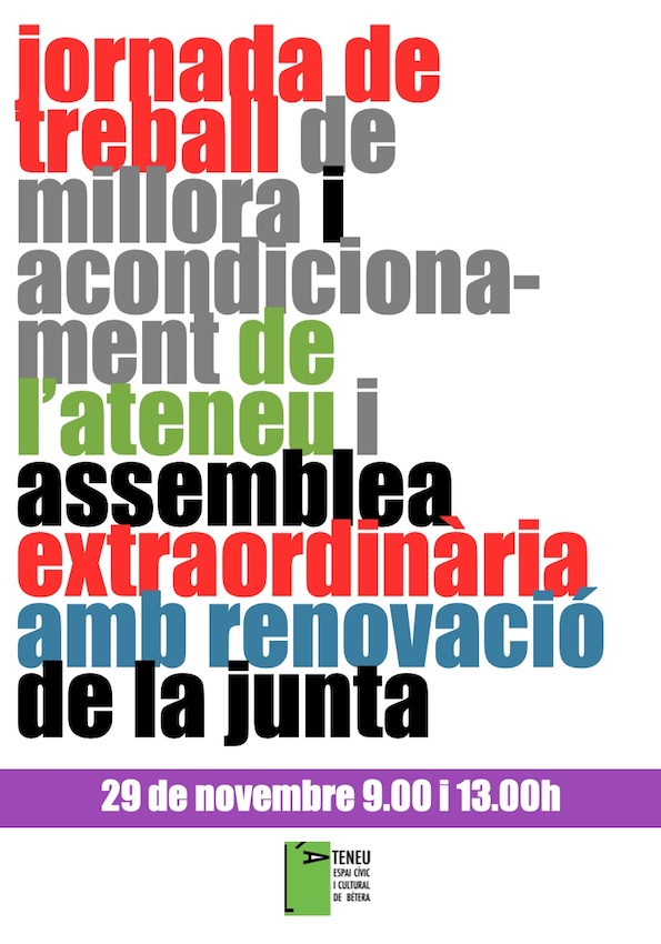 Dissabte 29 de novembre farem una matí de treball a l’ateneu, per millorar els espais i acondicionar les cambres per a magatzem. Qualsevol ajuda serà benvinguda. A partir de les 9.00, amb esmorzar de la casa.