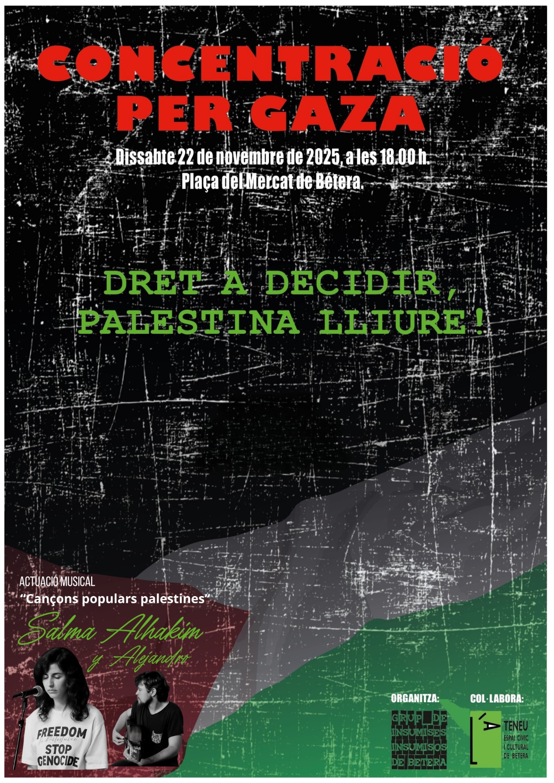Dissabte 22 de novembre, a partir de les 18.00, a la Plaça del Mercat de Bétera, hom farà una concentració en solidaritat amb el poble Palestí, per aturar el genocidi, per denunciar-lo almenys, després de més de seixanta mil assassinats… Després, a dins l’Ateneu, concert de Salma Alhakim, una jove veu palestina. Per la llibertat dels pobles i el dret a decidir el seu futur.