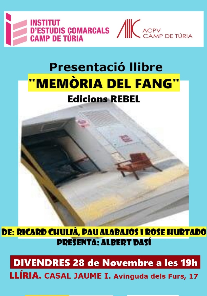 l’Institut d’estudis del Camp de Túria organitza la presentació del llibre “Memòria del fang” de Ricard Chulià i Pau Alabajos, al Casal Jaume I de Llíria. Si encara no heu llegit el llibre… Si encara no el teniu… Ah, els valencians, que no tenim memòria!