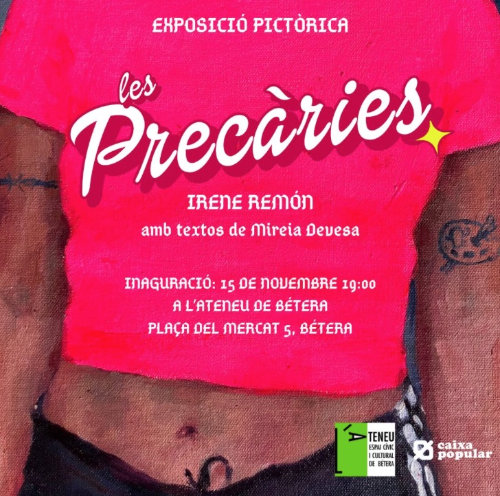 INAUGURACIÓ de “Les Precàries” amb quadres d’Irene Remon i textos de Mireia Devesa, comissariada per Aitana Cerdan Campos. Dissabte, 15 de novembre, a les 19.00h. Ateneu de Bétera, plaça del Mercat, 5