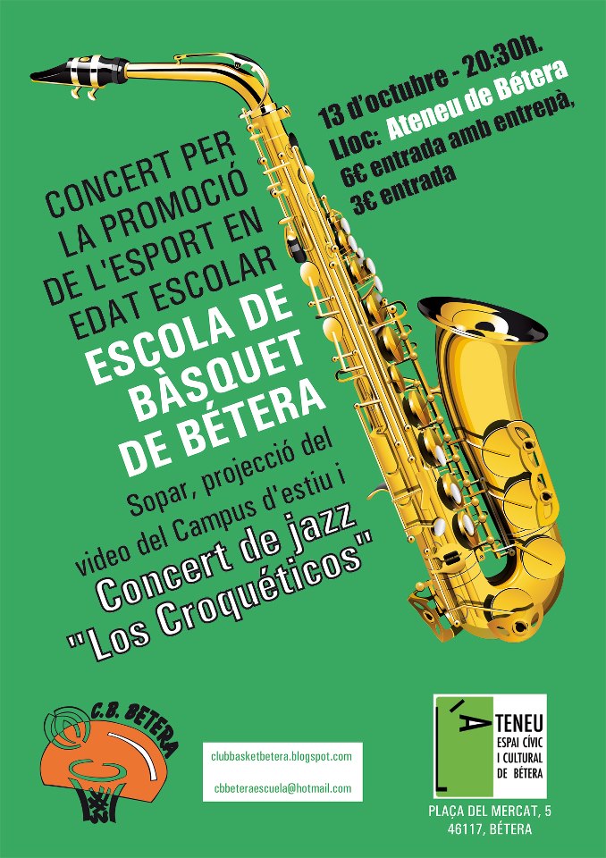 A partir de les 20.30 farem una vetllada de suport a l’esport base. Concretament a l’Escola de Bàsquet de Bétera, que s’ha quedat sense cap aportació econòmica municipal amb la qual cosa veu perillar la continuïtat. Hi haurà sopar, projecció del vídeo del campus d’estiu i concert de jazz, amb “Los croquéticos”. De manera excepcional, caldrà pagar una entrada per a entrar a l’Ateneu: 6 euros amb l’entrepà, i 3 euros sense.