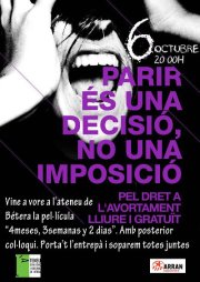 Dissabte 6 d’octubre, Arran Camp de Túria ens convida a un col·loqui sobre el dret de l’avortament, sota el títol Parir és una decisió, no una imposició. Serà després de la projecció del film “4 meses, 3 semanas y 2 días“, a les 20.00, que mostra la situació de desprotecció que sofreix una dona en cas d’avortament en un Estat on és il·legal fer-ho. En el col·loqui posterior es parlarà de la reforma de la llei d’interrupció de l’embaràs que prepara el govern espanyol. Després del debat hi haurà un concert en acústic, de Varea.
