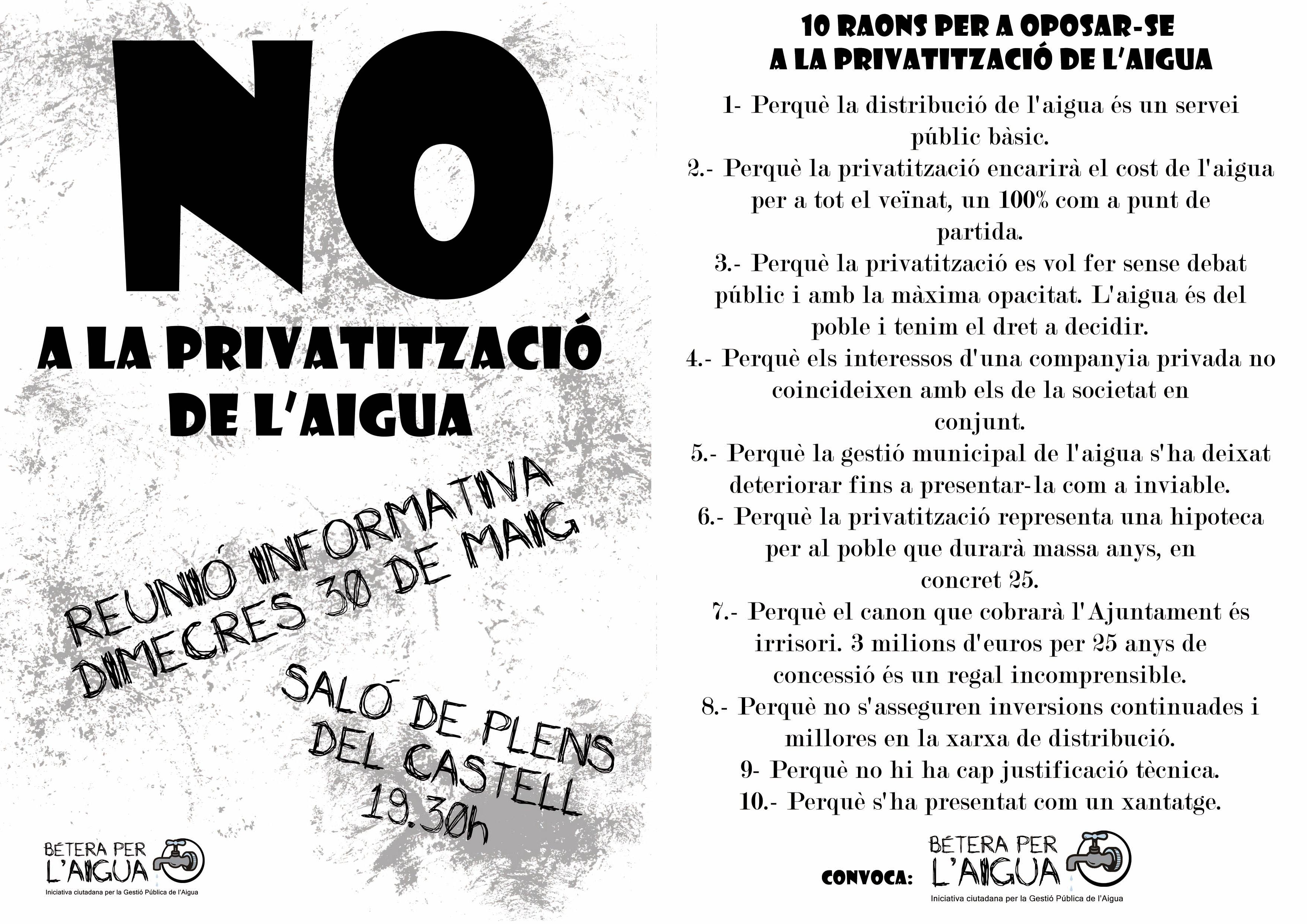 Pel seu interès vos informem de la reunió pública que tindrà lloc el dimecres 30 de maig, a les 19.30, al saló de plens del Castell de Bétera. La reunió l’ha convocada Bétera per l’aigua, Iniciativa Ciutadana per una Gestió Pública de l’Aigua. S’hi informarà dels plans de l’Ajuntament de privatitzar la gestió de l’aigua del poble, i de les accions previstes per la Iniciativa Ciutadana contra el projecte de privatització.