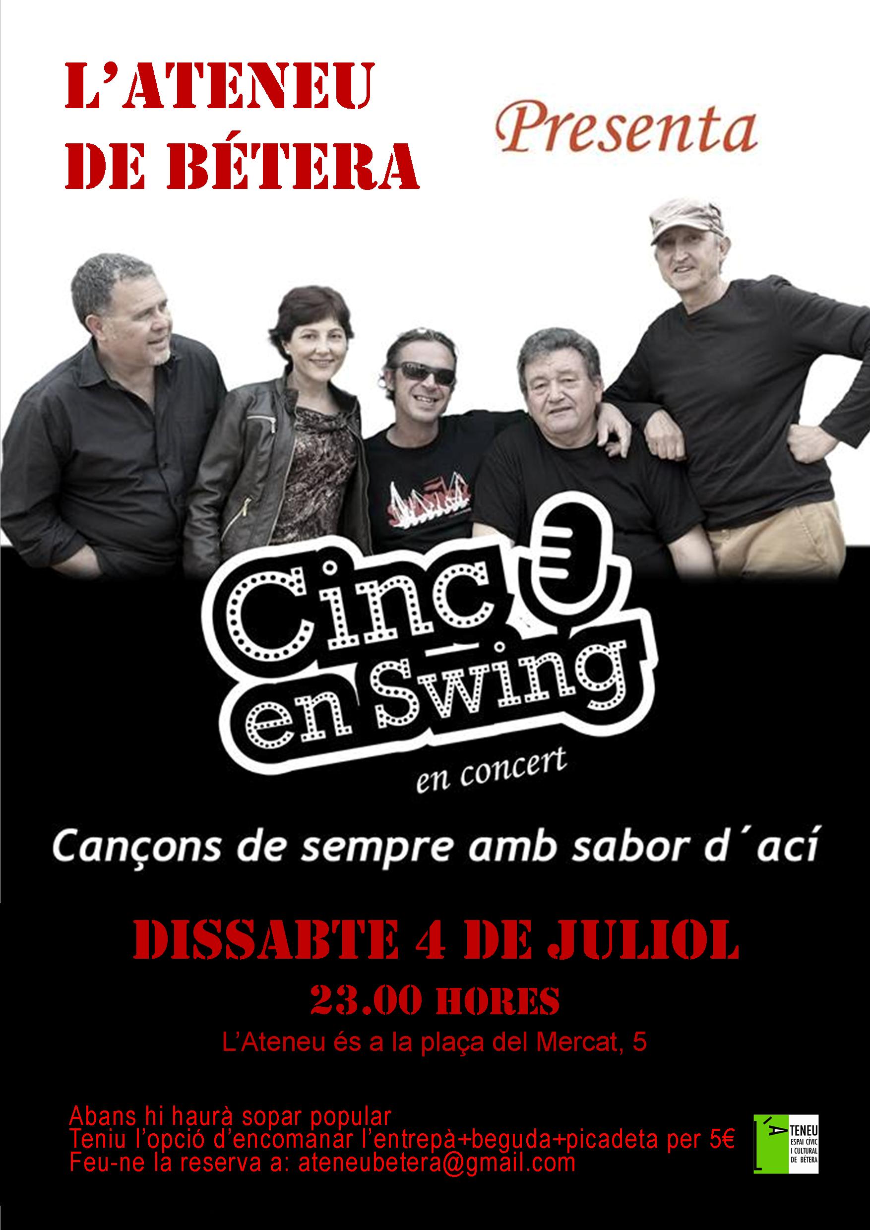Cinc en swingEl dissabte 4 de juliol, a les 23.00, festa de l’estiu ple amb el grup Cinc en swing: al poble, a la comarca, al cap i casal i al govern de la Generalitat, s’enceta una nova etapa plena d’esperances i incerteses després d’anys de manca d’intervenció social, maniobres fosques i malbaratament de recursos. El dissabte us convidem a celebrar-ho amb aquest conjunt (standards de jazz i cançons de totes les èpoques amb ritmes ballables). Abans hi haurà sopar popular; podeu reservar entrepà+picadeta+beguda per 5 euros, fins el dijous 2, a ateneubetera[arrova]gmail.com.