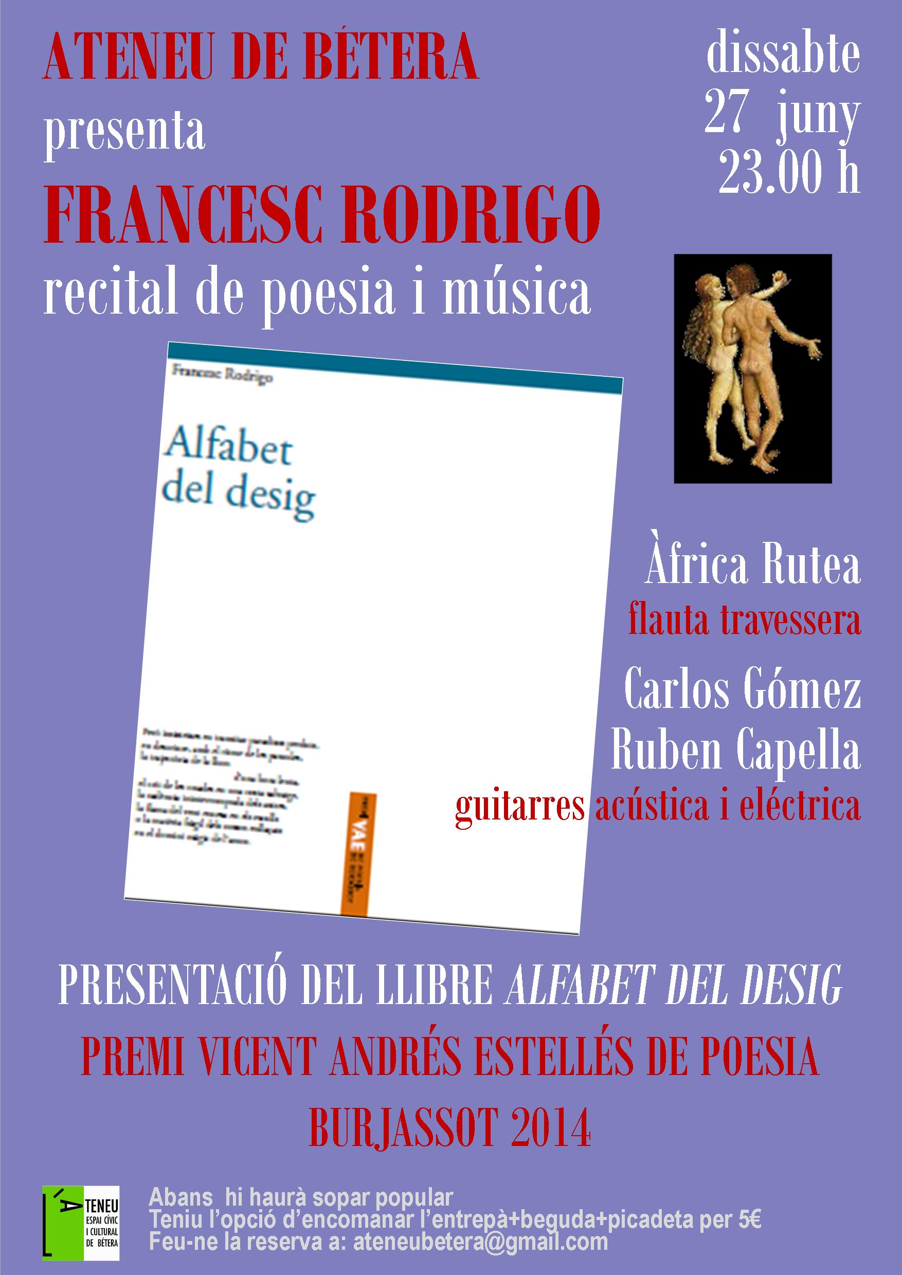francesc_rodrigoEl dissabte 27 de juny, en acabant de sopar, a les 23.00, vos presentem un recital de poesia de Francesc Rodrigo, premi Vicent Andrés Estellés de poesia Burjassot 2014, acompanyat de flauta travessera i guitarres.